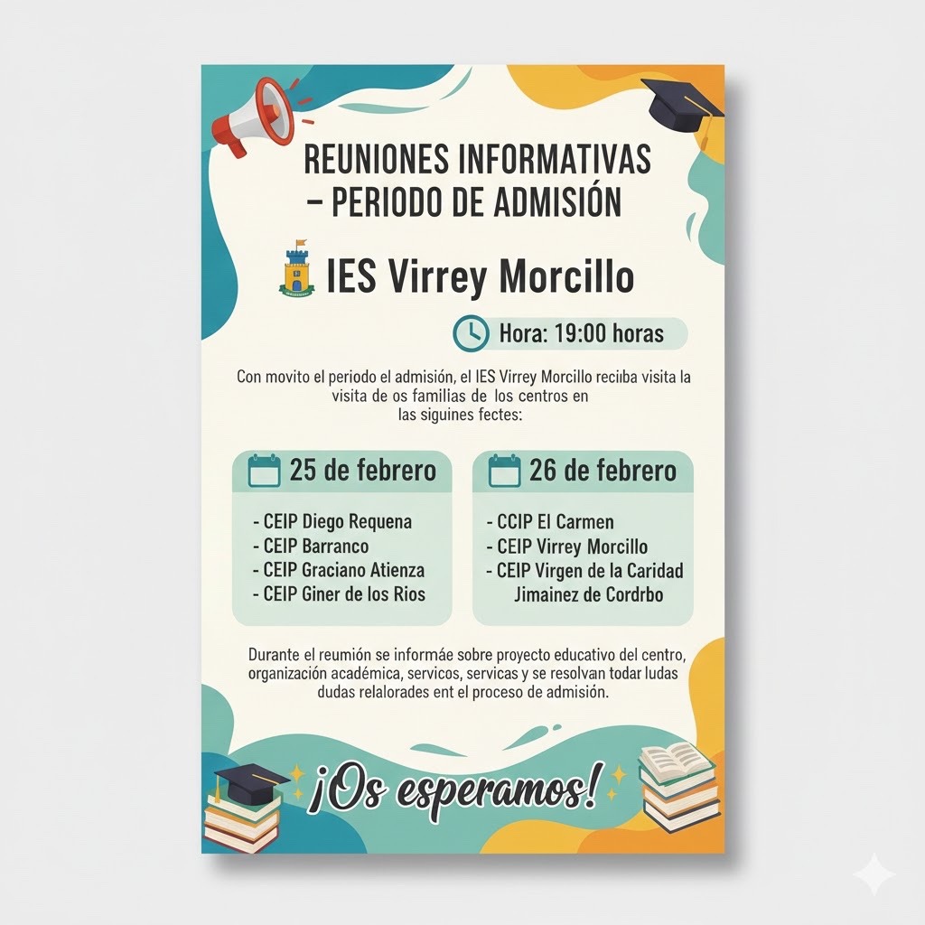 Con motivo del periodo de admisión, el IES Virrey Morcillo recibirá la visita de las familias de los centros en las siguientes fechas: