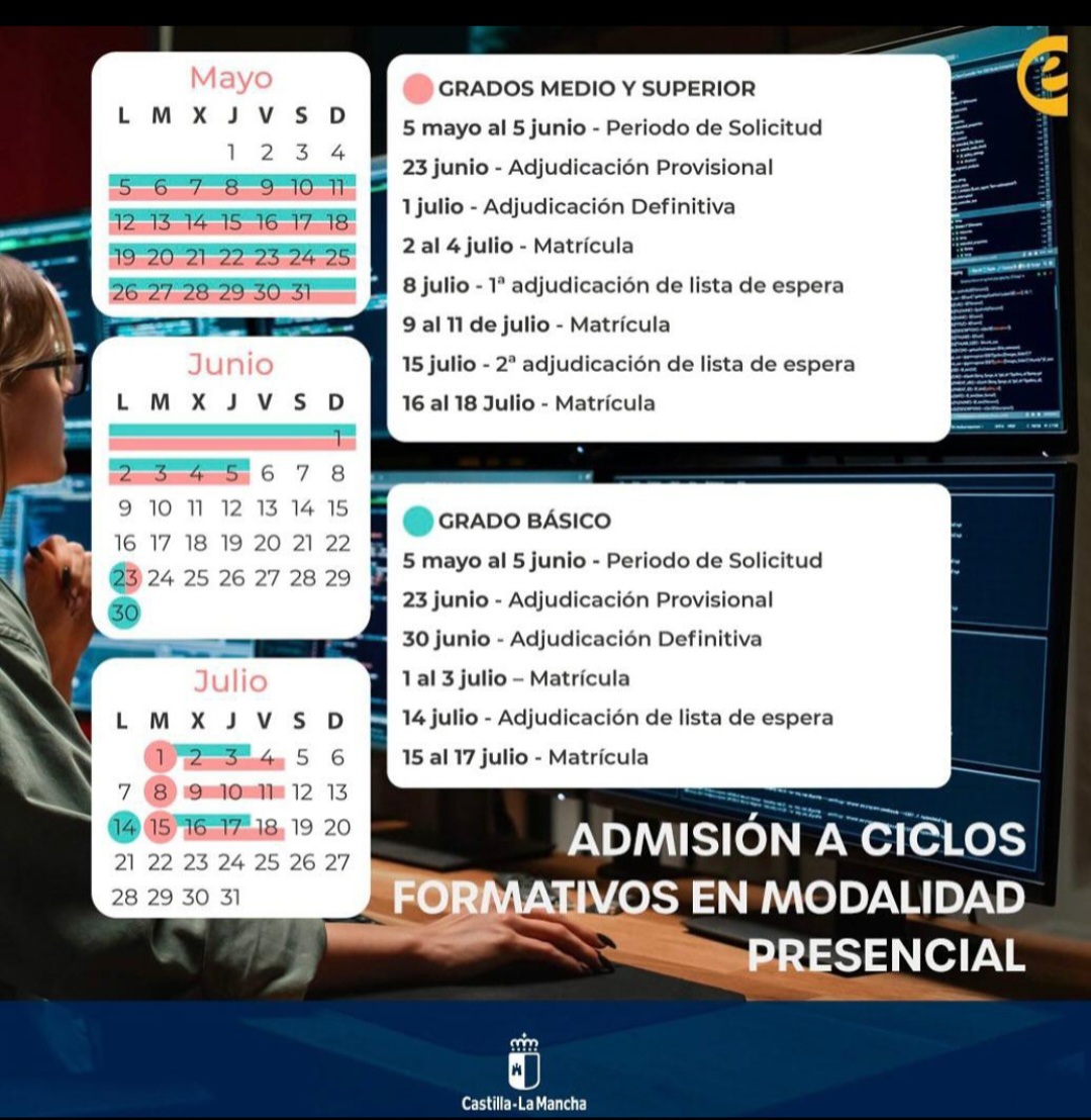 PERIODO EXTRAORDINARIO. (Periodo habilitado con el objeto de que se puedan formular nuevas solicitudes de admisión a ciclos formativos donde hayan quedado vacantes disponibles sin lista de espera) Periodo de solicitud: Entre el 2 y el 5 de septiembre de 2025. Baremo y adjudicación definitiva: Realizada el 16 de septiembre de 2025. Matrícula: Preferentemente a través de la plataforma EducamosCLM en el plazo comprendido entre el 17 y el 19 de septiembre de 2025 (la NO matriculación supone la exclusión en el proceso de cara a futuras adjudicaciones). |