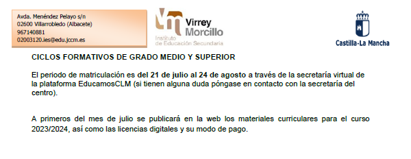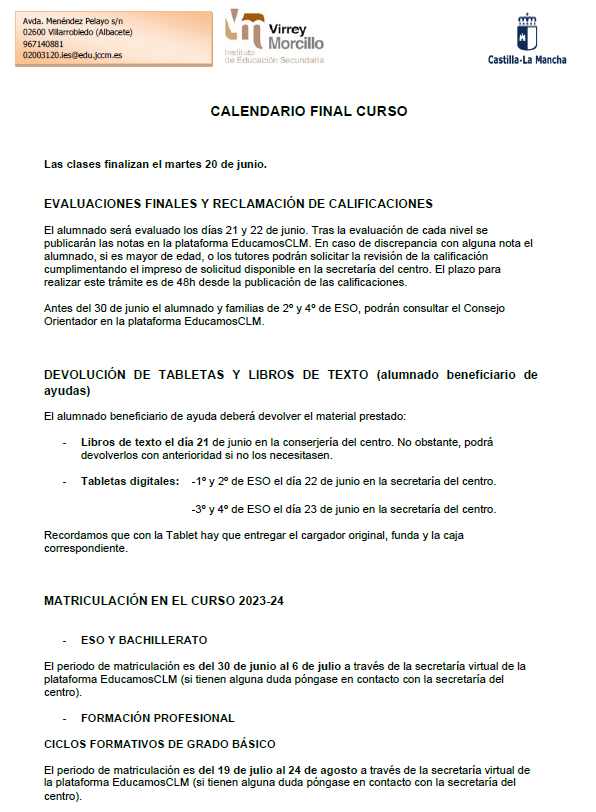 Calendario Final de Curso 16 de junio de 2023 Información y calendario final de curso sobre finalización de las clases, evaluaciones finales, reclamación de calificaciones, devolución de tabletas / libros de texto, y fechas de matrícula para el curso siguiente : Matrícula