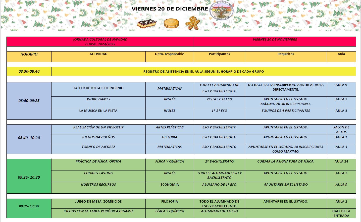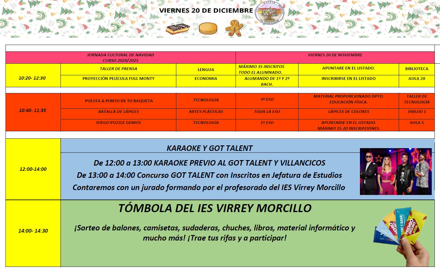 El próximo viernes 20 de diciembre celebraremos en el IES una Jornada Cultural Navideña con las siguientes actividades :